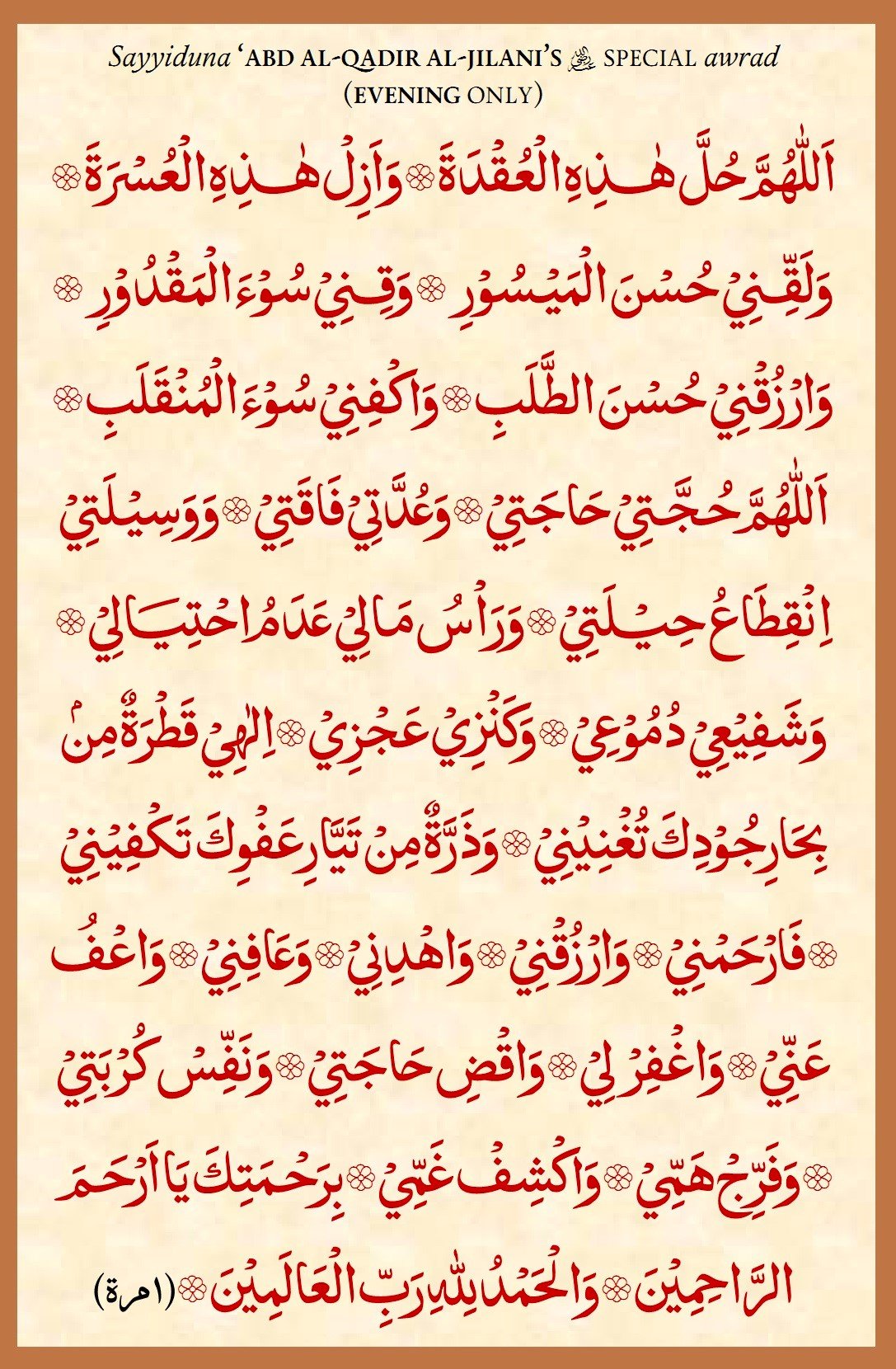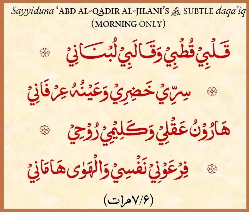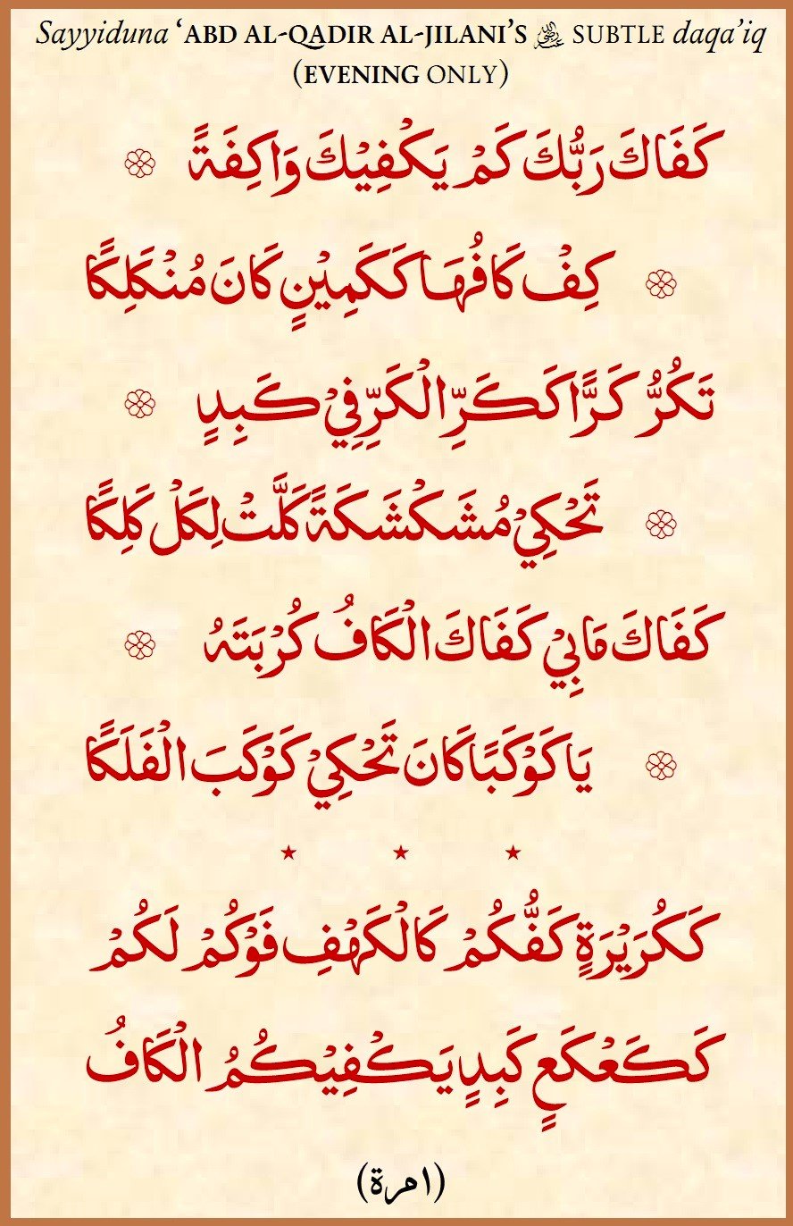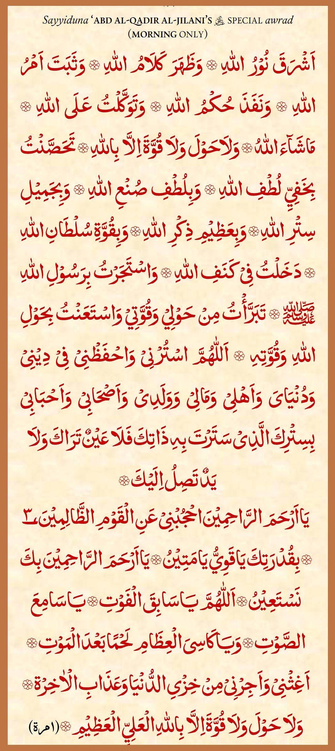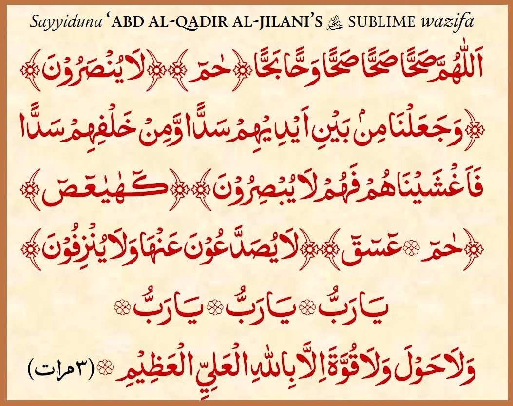 1. Sayyiduna ash-Shaikh ‘Abd al-Qadir al-Jilani (رحمه الله) has presented this noble wazifa for recitation every morning and evening, three times. In so doing, no harm will befall the reciter, by the leave of Allah. (Fuyudat Rabbaniyya p.42)