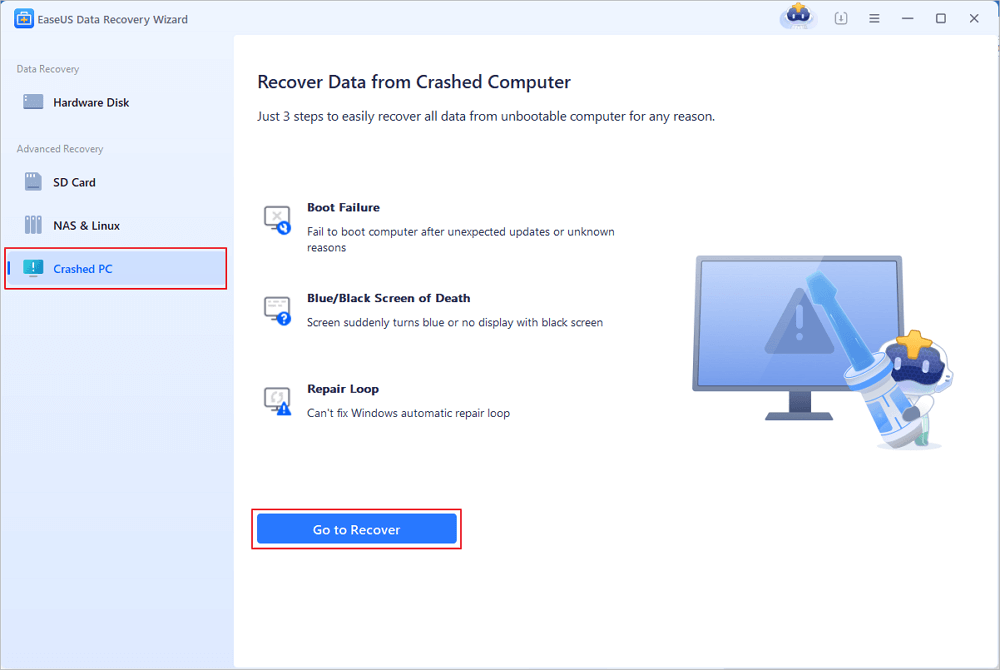Launch EaseUS Data Recovery Wizard, choose “Crashed PC” and click “Go to Recover”.