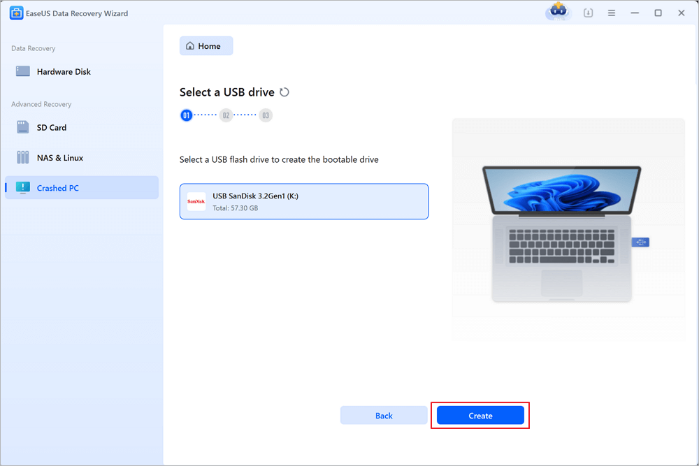 Select an empty USB to create the bootable drive and click “Create”.