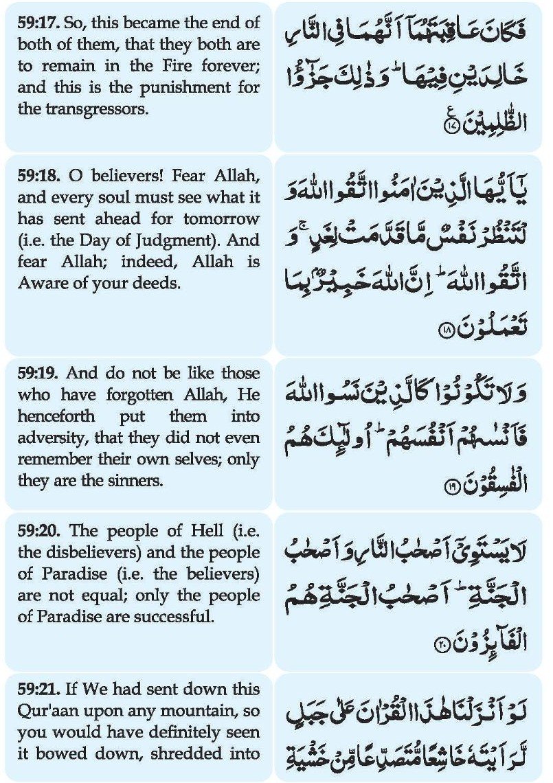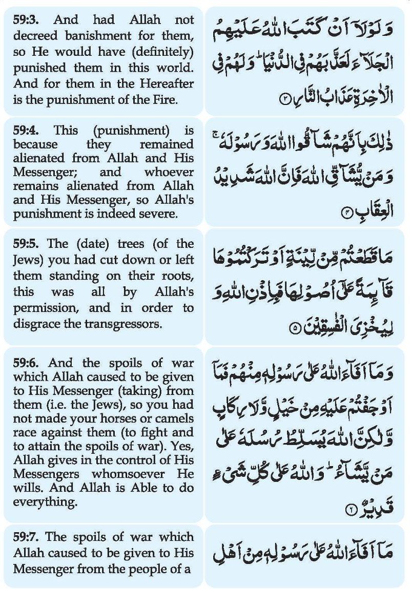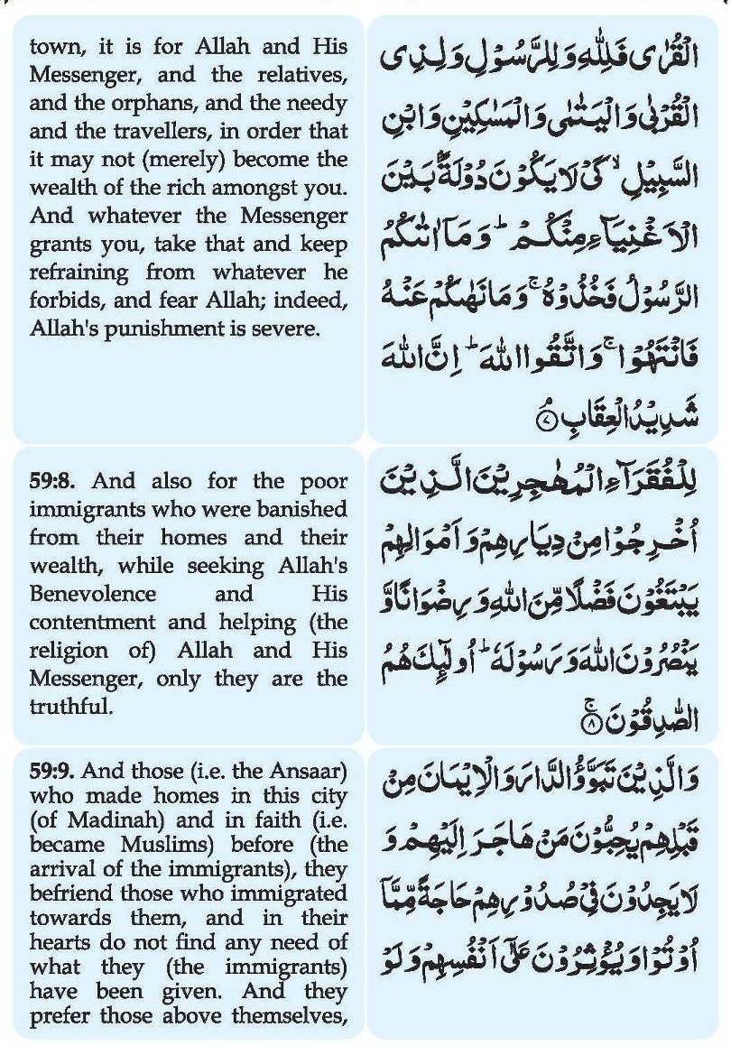 7. Maaa afaaa’al laahu ‘alaa Rasoolihee min ahlil quraa falillaahi wa lir Rasooli wa lizil qurbaa wal yataamaa walmasaakeeni wabnis sabeeli kai laa yakoona doolatam bainal aghniyaaa’i minkum; wa maaa aataakumur Rasoolu fakhuzoohu wa maa nahaakum ‘anhu fantahoo; wattaqul laaha innal laaha shadeedul-‘iqaab