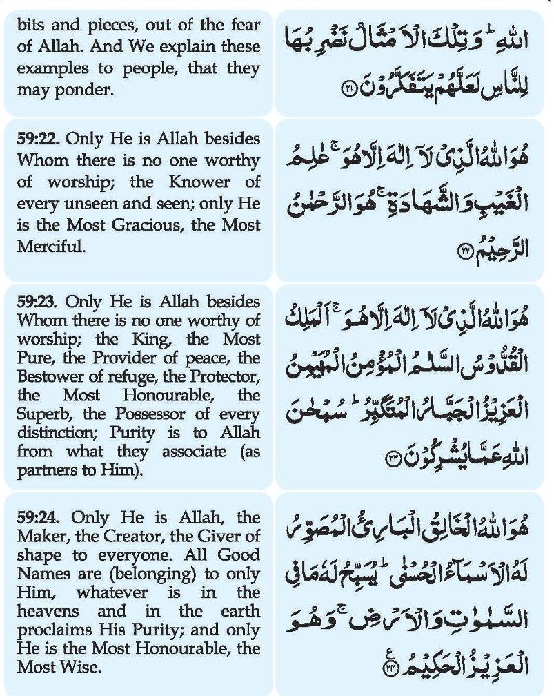 22. Huwal-laahul-lazee laaa Ilaaha illaa Huwa ‘Aalimul Ghaibi wash-shahaada; Huwar Rahmaanur-Raheem
