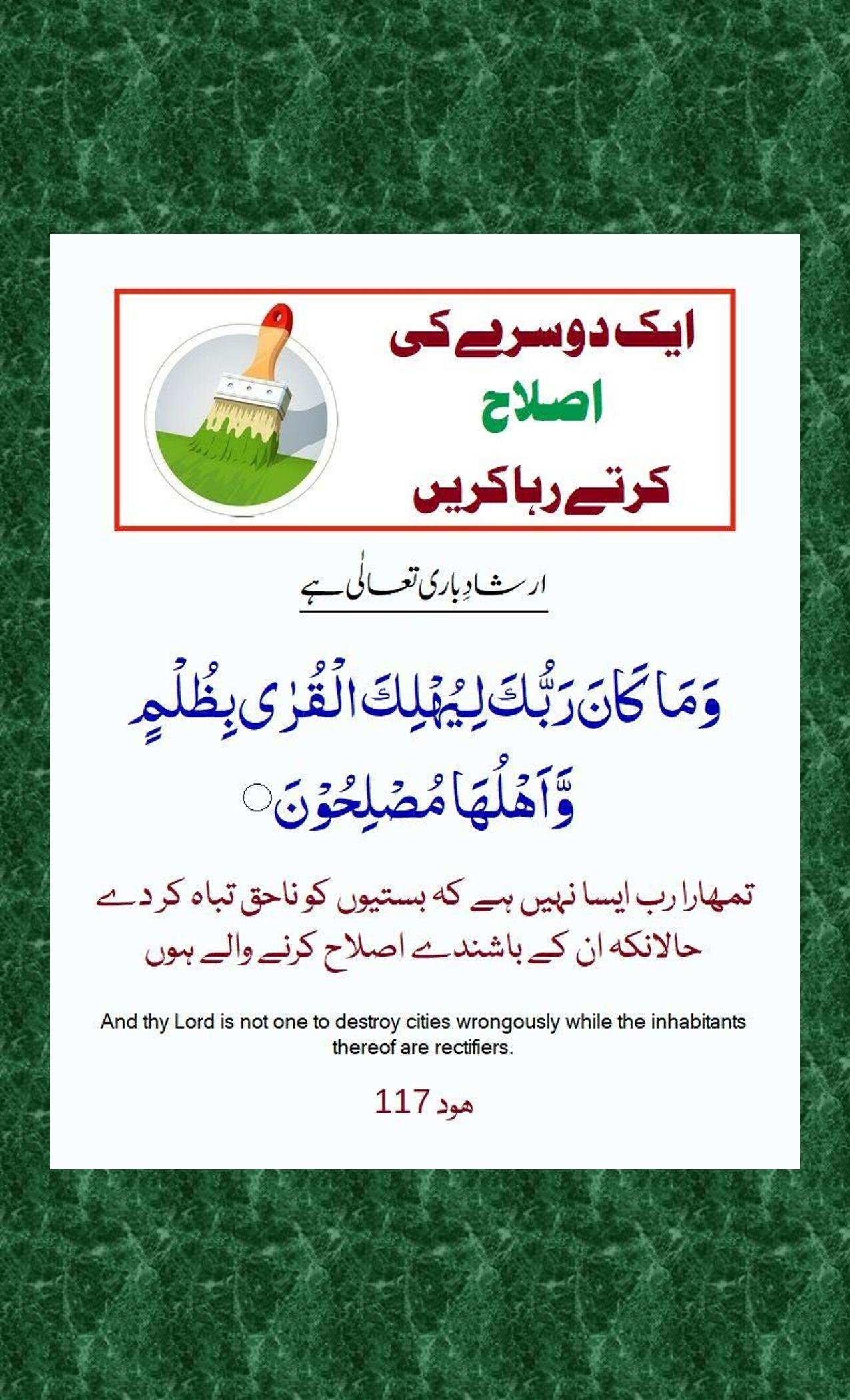 - Wa maa kaana Rabbuka liyuhlikal quraa bizulminw wa ahluhaa muslihoon