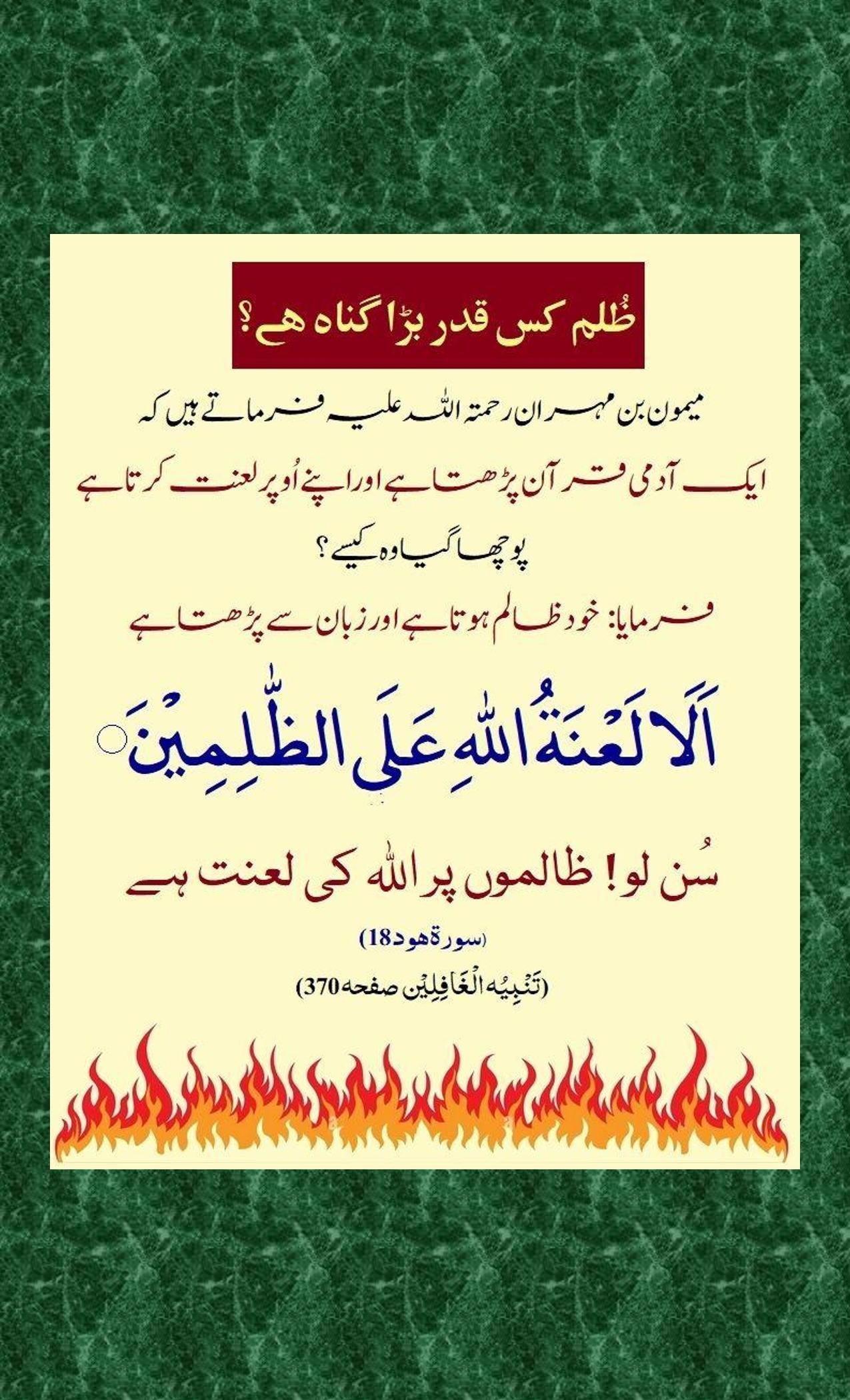 - Wa laa tarkanooo ilal lazeena zalamoo fatamassa kumun Naaru wa maa lakum min doonil laahi min awliyaaa’a summa laa tunsaroon