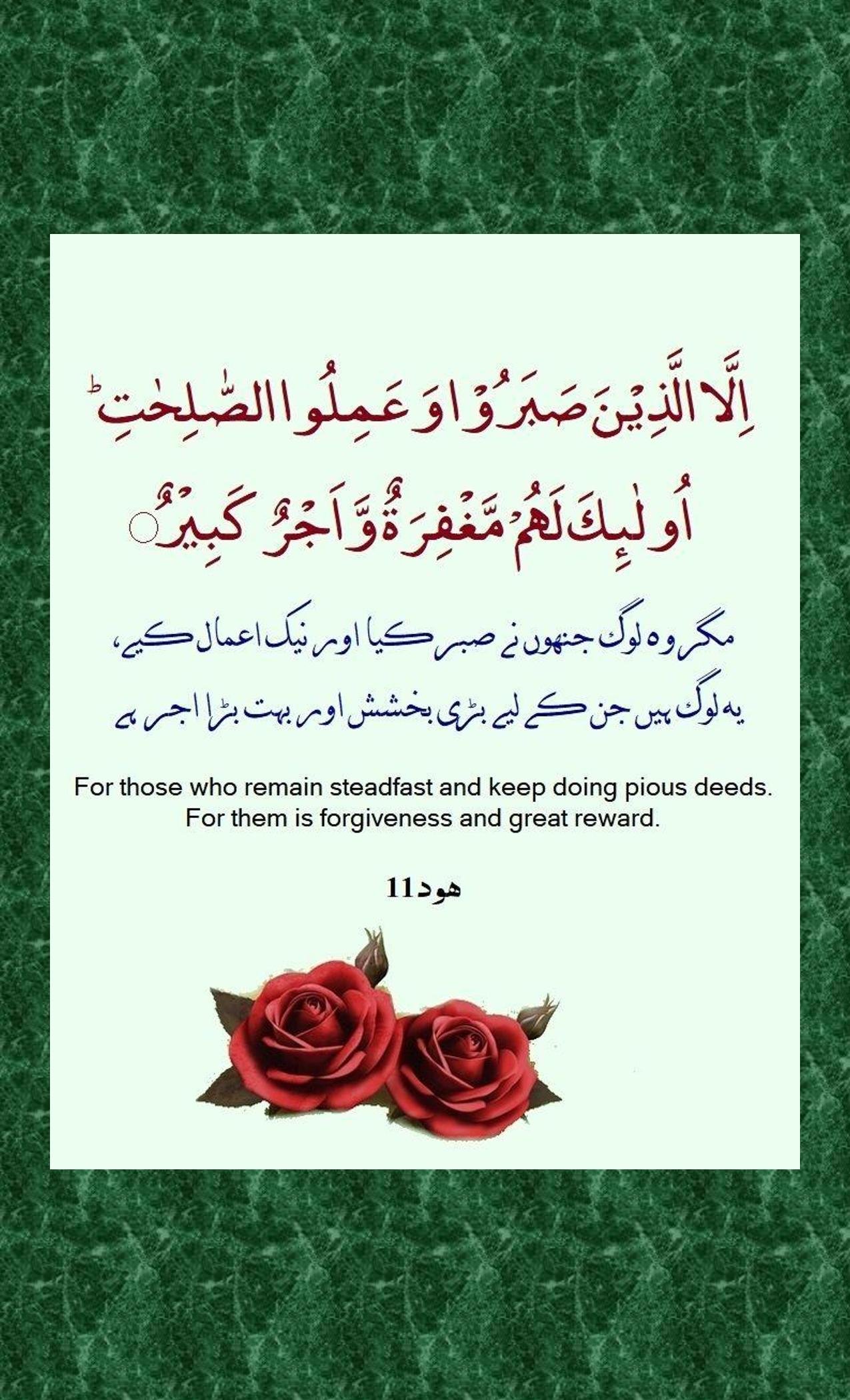 - Illal lazeena sabaroo wa ‘amilus saalihaati ulaaa’ika lahum maghfiratunw wa ajrun kabeer
