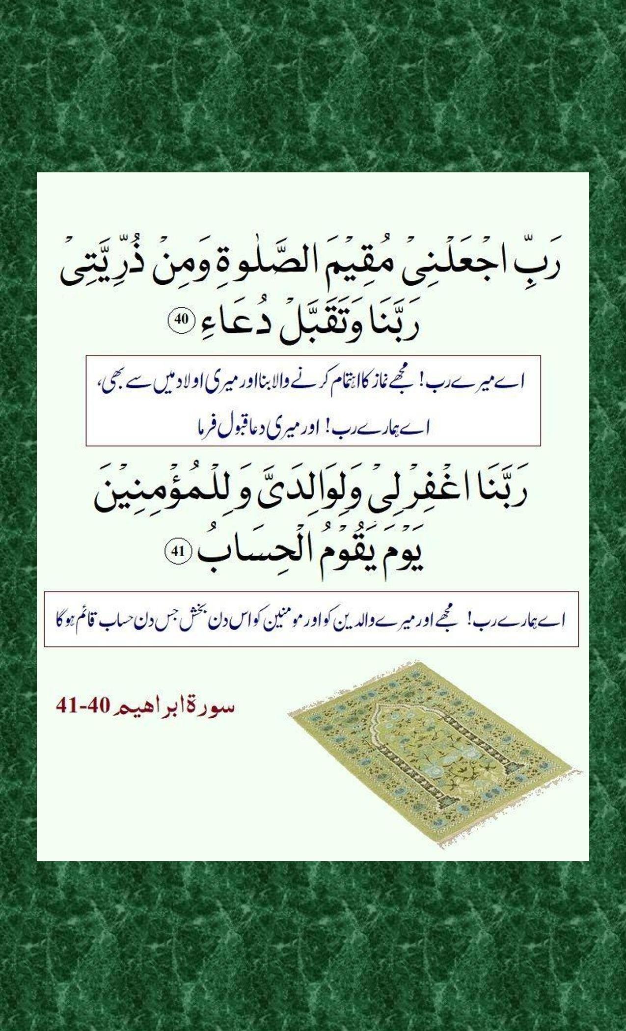 40. Rabbij ‘alnee muqeemas Salaati wa min zurriyyatee Rabbanaa wa taqabbal du’aaa’