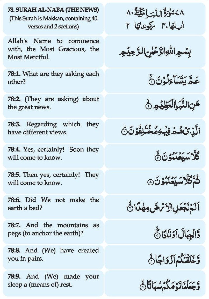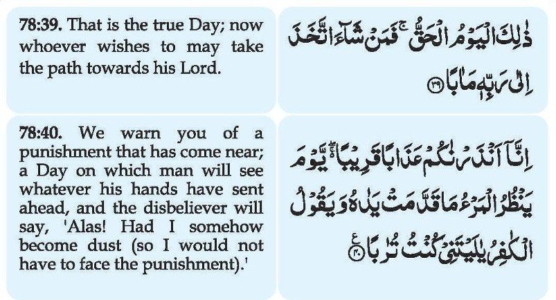 40. In naa anzar naakum azaaban qareebaiy-yauma yan zurul marr-u maa qaddamat yadaahu wa ya qoolul-kaafiru yaa lai tanee kuntu turaaba (section 2)